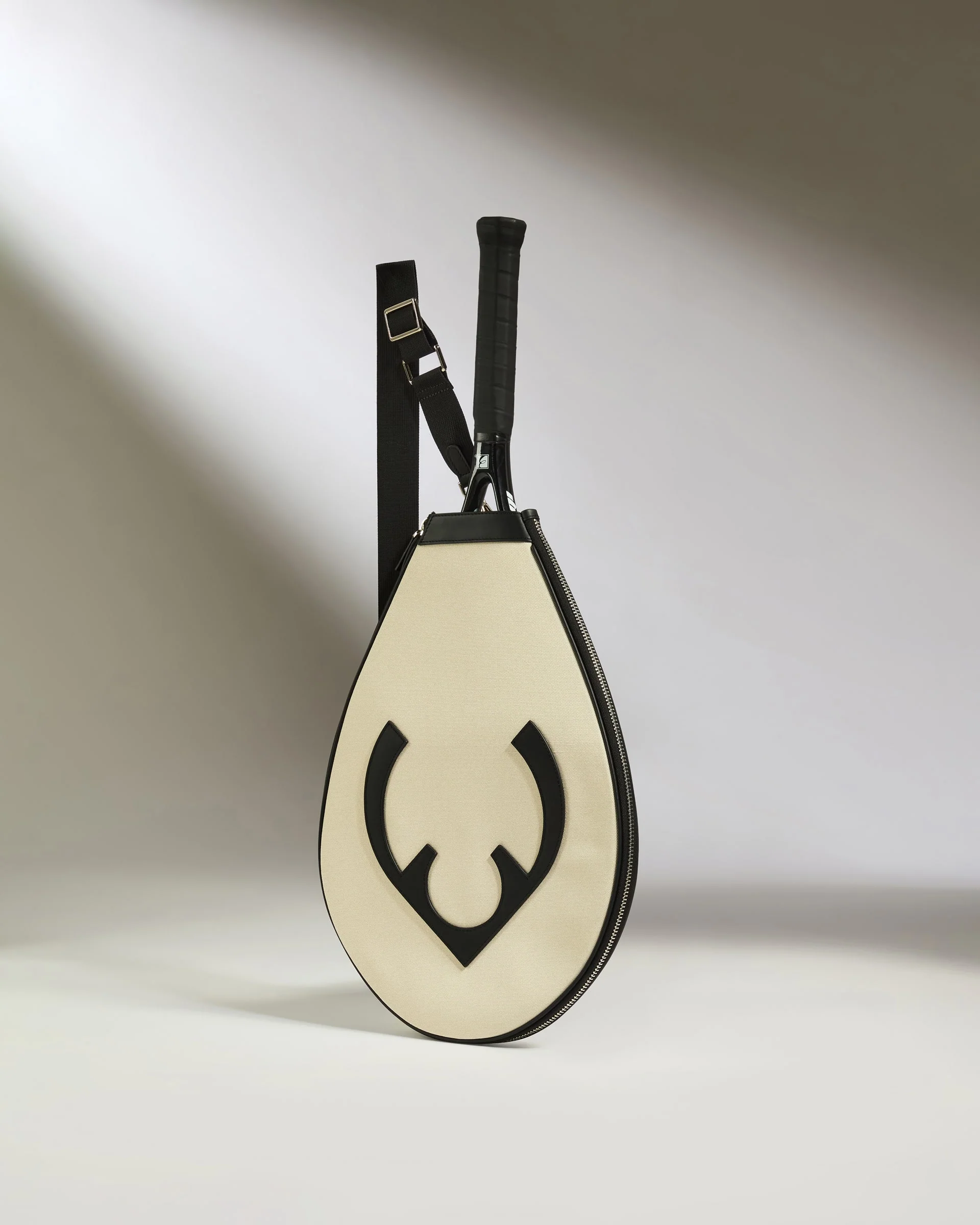 Our limited edition Tennis Racket Cover is a sporty essential, reimagined. Made from durable, water-repellent materials in a sophisticated monochrome palette, wear it on its own or clipped onto the Reversible Tote Bag for a seamless summer set-up.